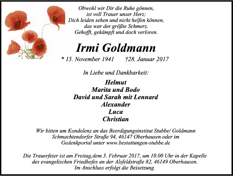 Mit Ihnen trauern wir . Fast 7 Jahre waren wir Nachbarn und haben viel gelacht zusammen.