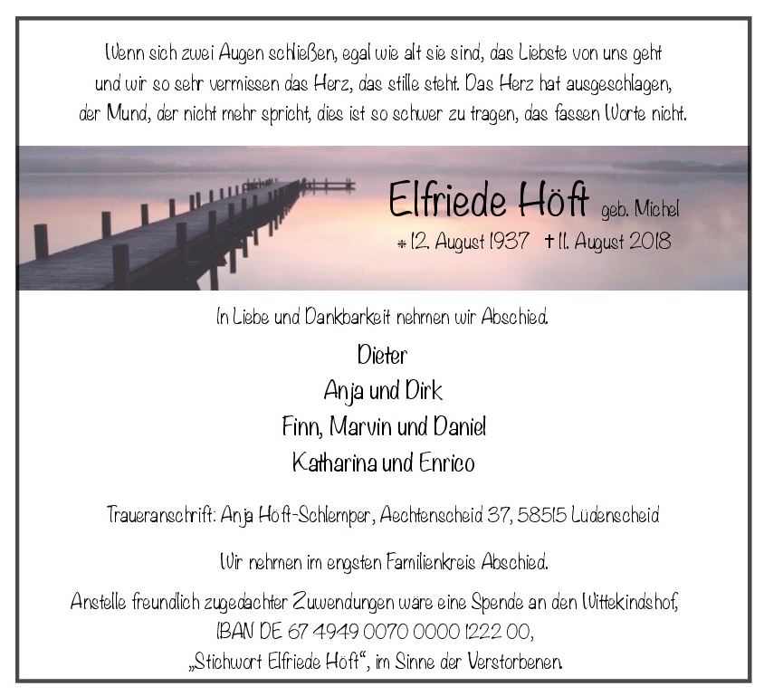 wir wünschen Ihnen von Herzen viel Kraft, dass Sie Menschen um sich haben, die Ihnen in dieser schweren Zeit beistehen und Halt geben. Zusätzlich können Sie auf dieser Gedenkseite Erinnerungen teilen und so das Andenken gemeinsam wachhalten.