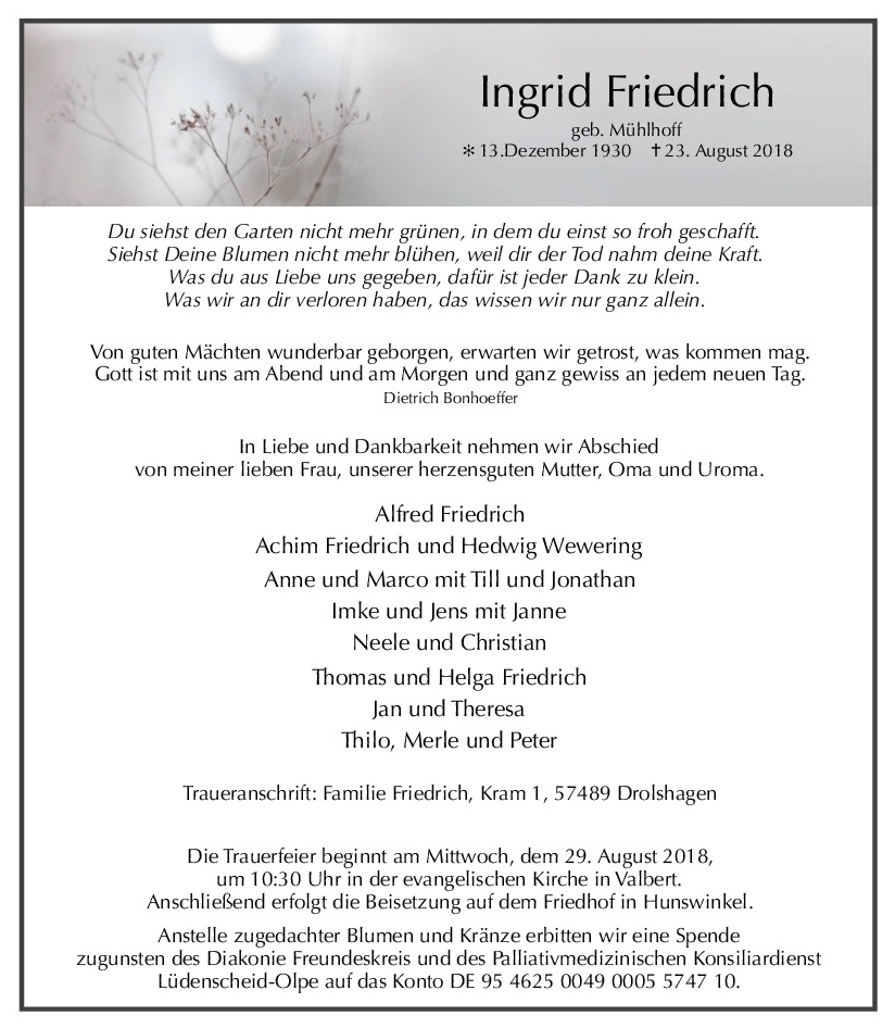 wir wünschen Ihnen von Herzen viel Kraft, dass Sie Menschen um sich haben, die Ihnen in dieser schweren Zeit beistehen und Halt geben. Zusätzlich können Sie auf dieser Gedenkseite Erinnerungen teilen und so das Andenken gemeinsam wachhalten.