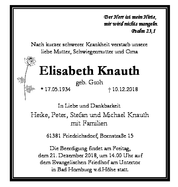 †10.12.2018, Ruhestätte: Ev. Friedhof, Bad Homburg