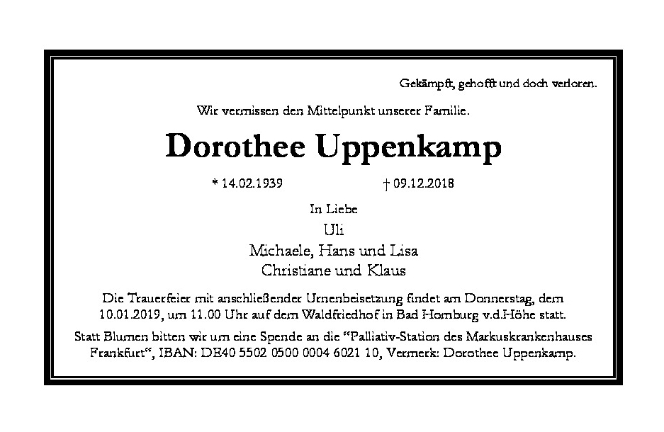 Lieber Uli, wir trauern mit Dir und Deinen Lieben um Dorothee. Wir wünschen Euch viel Kraft in dieser schweren Zeit. In unserer Erinnerung haben wir die Bilder von Dorothee auf den Sommerfesten im Hasengarten und in der Villa Bonn im Juni 2018. Wir denken an Euch. Liebe Grüße von Sabine & MIchael mit Felix