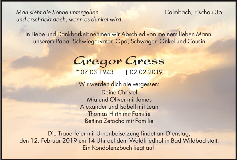 †02.02.2019, Ruhestätte: Waldfriedhof Bad Wildbad