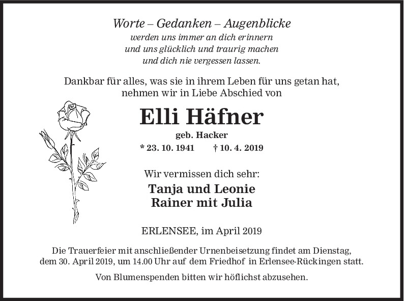 Liebe Elli, du warst viel mehr als nur unsere Schneiderin für mich!! Du wirst immer einen besonderen Platz in meinem Herzen haben.. R.I.P liebe Elli Die Menschen, die von uns gehen und die wir lieben, verschwinden nicht. Sie sind immer an unserer Seite... Jeden Tag... ungesehen, ungehört, und dennoch immer ganz nah bei uns. Für immer geliebt und für immer vermisst, bleiben sie für immer in unserem Herzen.