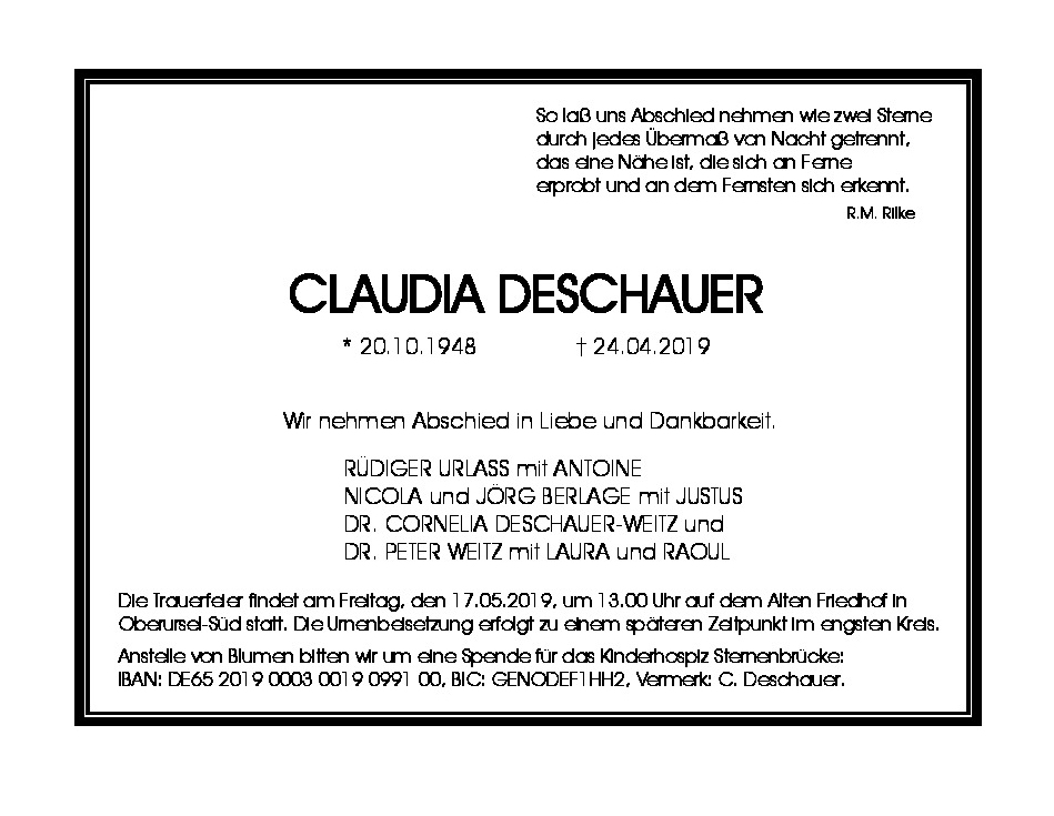 Ich kann kaum glauben dass Claudia nicht mehr Da ist! Es tut mir furchtbar Leid. Ich war so froh dass Wir uns alle Vier vor ein paar Jahre wiedergetroffen haben. Leider haben wir seitdem keine andere Gelegenheit uns wieder zu treffen gehabt. Wirklich Schade!