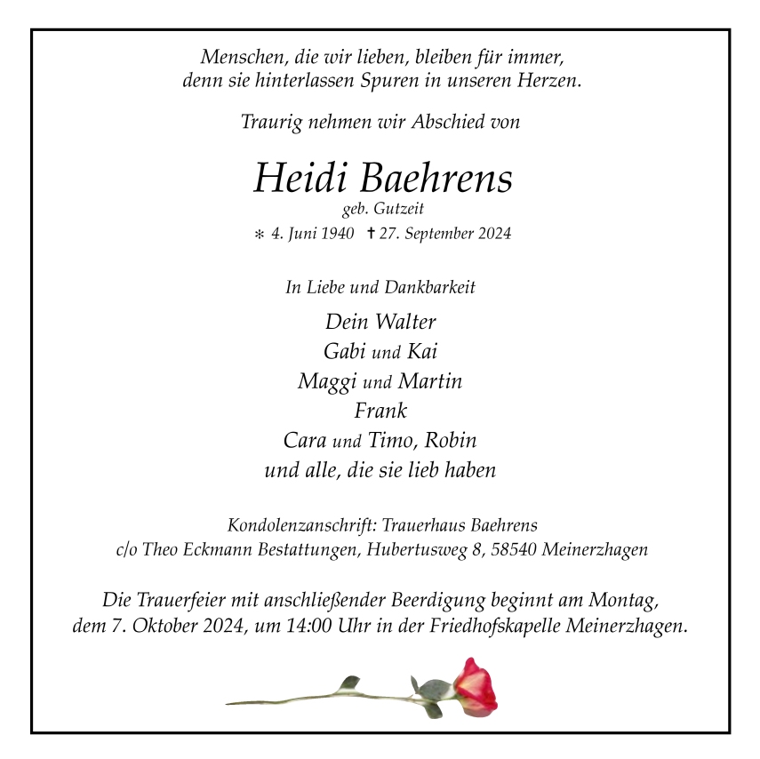 in diesen Tagen fühlen wir mit Ihnen und wünschen Ihnen von Herzen, dass Sie aus den glücklichen Erinnerungen Kraft schöpfen, um positiv in die Zukunft zu gehen. Diese Gedenkseite möge Ihnen dabei helfen, Ihre Trauer zu teilen und das Andenken gemeinsam wachzuhalten.
