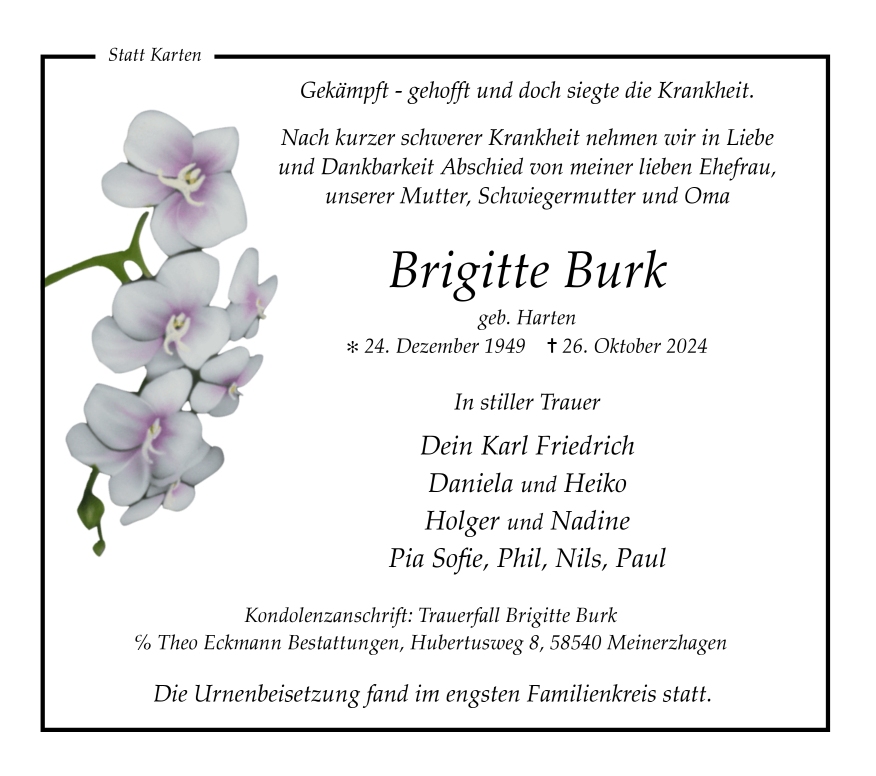 in diesen Tagen fühlen wir mit Ihnen und wünschen Ihnen von Herzen, dass Sie aus den glücklichen Erinnerungen Kraft schöpfen, um positiv in die Zukunft zu gehen. Diese Gedenkseite möge Ihnen dabei helfen, Ihre Trauer zu teilen und das Andenken gemeinsam wachzuhalten.