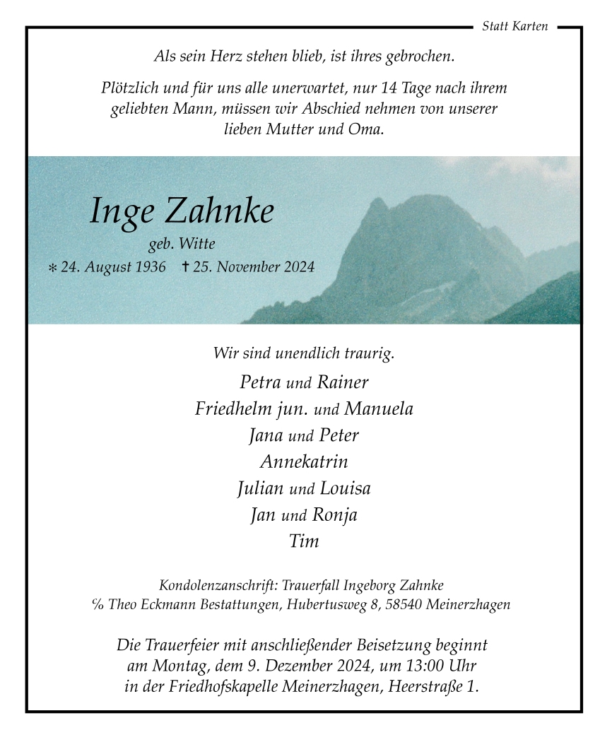 in diesen Tagen fühlen wir mit Ihnen und wünschen Ihnen von Herzen, dass Sie aus den glücklichen Erinnerungen Kraft schöpfen, um positiv in die Zukunft zu gehen. Diese Gedenkseite möge Ihnen dabei helfen, Ihre Trauer zu teilen und das Andenken gemeinsam wachzuhalten.