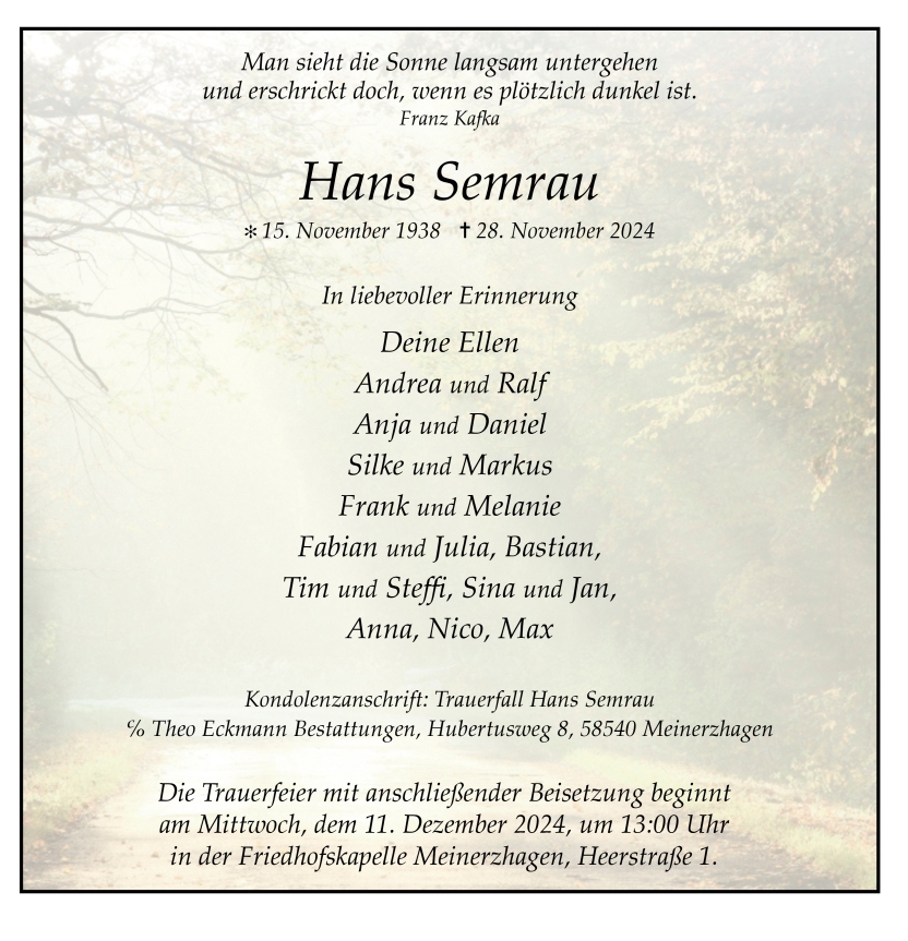 in diesen Tagen fühlen wir mit Ihnen und wünschen Ihnen von Herzen, dass Sie aus den glücklichen Erinnerungen Kraft schöpfen, um positiv in die Zukunft zu gehen. Diese Gedenkseite möge Ihnen dabei helfen, Ihre Trauer zu teilen und das Andenken gemeinsam wachzuhalten.