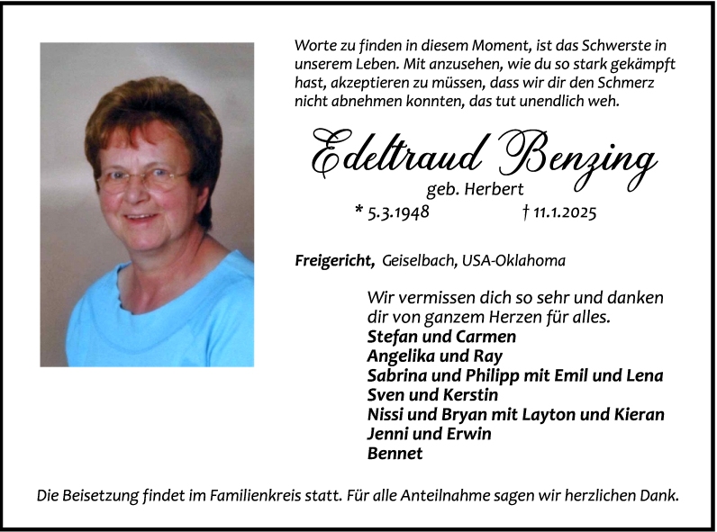 Liebe Familie, ich möchte mein tief empfundenes Mitgefühl aussprechen. Ich durfte Edeltraud als sehr liebevollen Menschen mit ganz großem Herzen kennenlernen. ❤