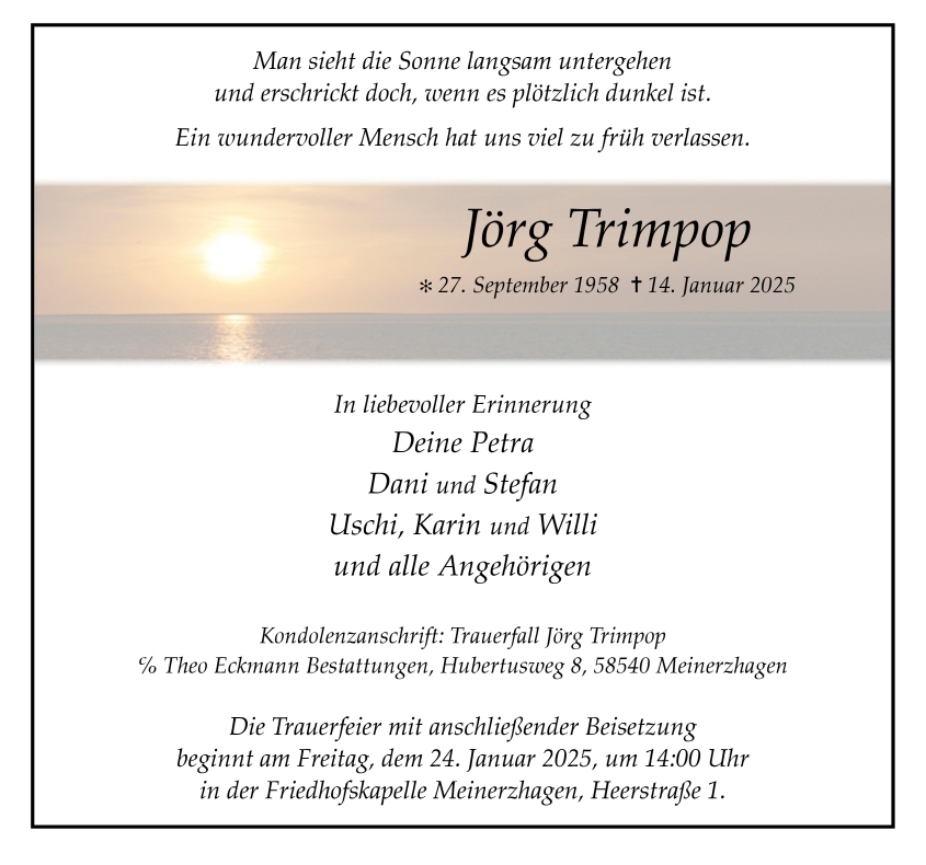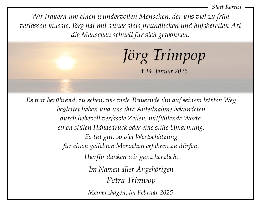 in diesen Tagen fühlen wir mit Ihnen und wünschen Ihnen von Herzen, dass Sie aus den glücklichen Erinnerungen Kraft schöpfen, um positiv in die Zukunft zu gehen. Diese Gedenkseite möge Ihnen dabei helfen, Ihre Trauer zu teilen und das Andenken gemeinsam wachzuhalten.