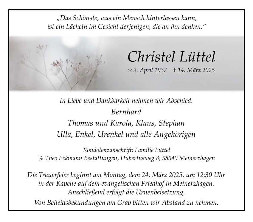 in diesen Tagen fühlen wir mit Ihnen und wünschen Ihnen von Herzen, dass Sie aus den glücklichen Erinnerungen Kraft schöpfen, um positiv in die Zukunft zu gehen. Diese Gedenkseite möge Ihnen dabei helfen, Ihre Trauer zu teilen und das Andenken gemeinsam wachzuhalten.
