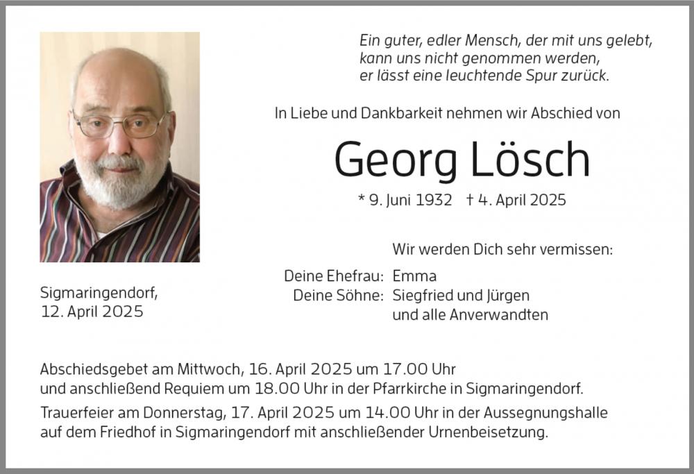 Abschiedsgebet am Mittwoch, 16. April 2025 um 17.00 Uhr und anschließend Requiem um 18.00 Uhr in der Pfarrkirche Sigmaringendorf.