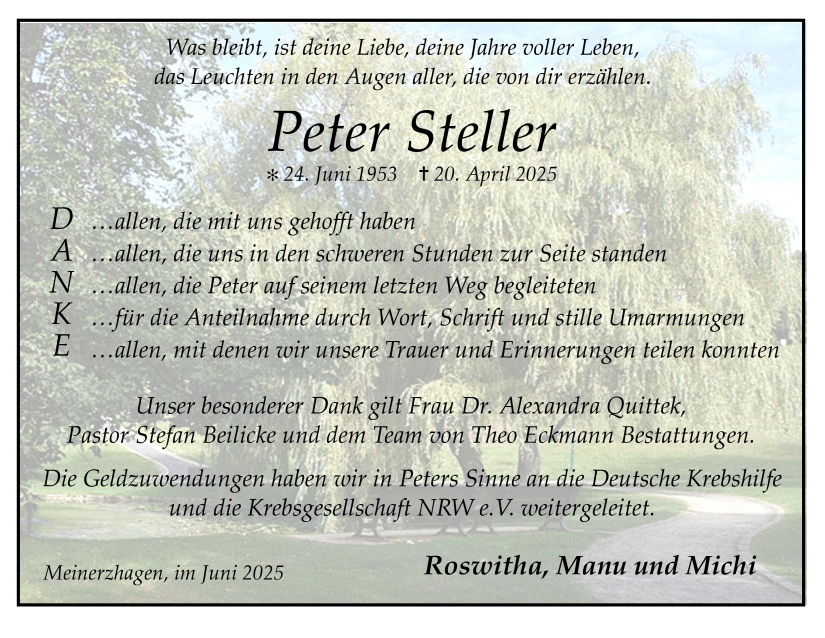 in diesen Tagen fühlen wir mit Ihnen und wünschen Ihnen von Herzen, dass Sie aus den glücklichen Erinnerungen Kraft schöpfen, um positiv in die Zukunft zu gehen. Diese Gedenkseite möge Ihnen dabei helfen, Ihre Trauer zu teilen und das Andenken gemeinsam wachzuhalten.