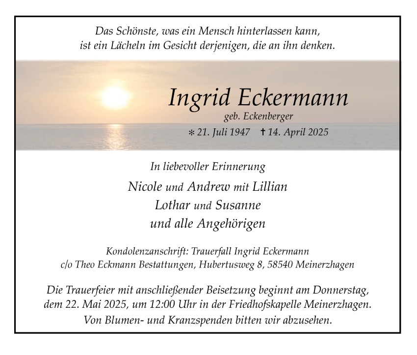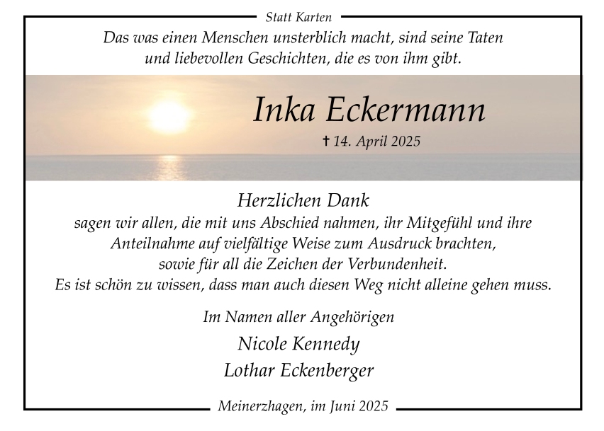 in diesen Tagen fühlen wir mit Ihnen und wünschen Ihnen von Herzen, dass Sie aus den glücklichen Erinnerungen Kraft schöpfen, um positiv in die Zukunft zu gehen. Diese Gedenkseite möge Ihnen dabei helfen, Ihre Trauer zu teilen und das Andenken gemeinsam wachzuhalten.