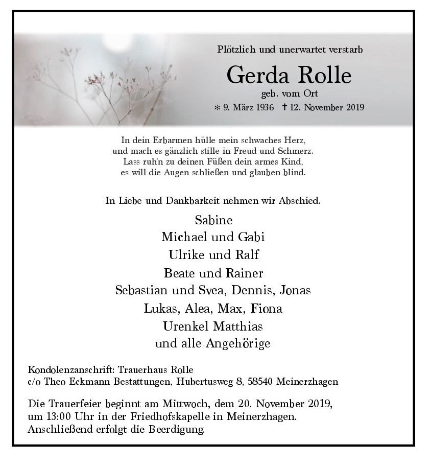 in diesen Tagen fühlen wir mit Ihnen und wünschen Ihnen von Herzen, dass Sie aus den glücklichen Erinnerungen Kraft schöpfen, um positiv in die Zukunft zu gehen.