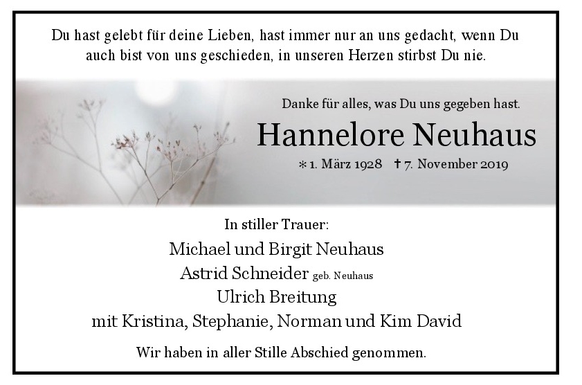 in diesen Tagen fühlen wir mit Ihnen und wünschen Ihnen von Herzen, dass Sie aus den glücklichen Erinnerungen Kraft schöpfen, um positiv in die Zukunft zu gehen.