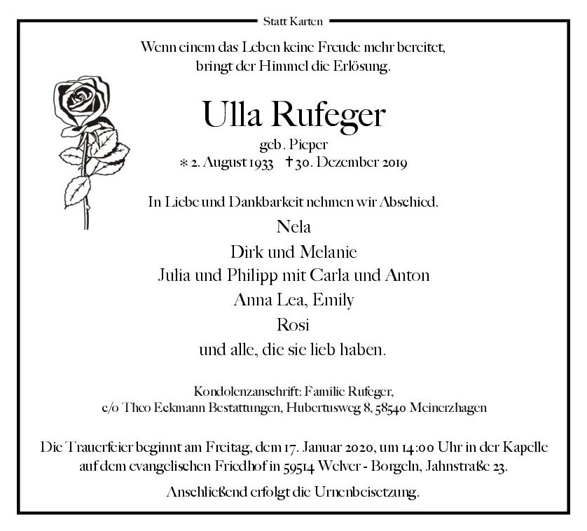 wir wünschen Ihnen von Herzen viel Kraft, dass Sie Menschen um sich haben, die Ihnen in dieser schweren Zeit beistehen und Halt geben. Zusätzlich können Sie auf dieser Gedenkseite Erinnerungen teilen und so das Andenken gemeinsam wachhalten.