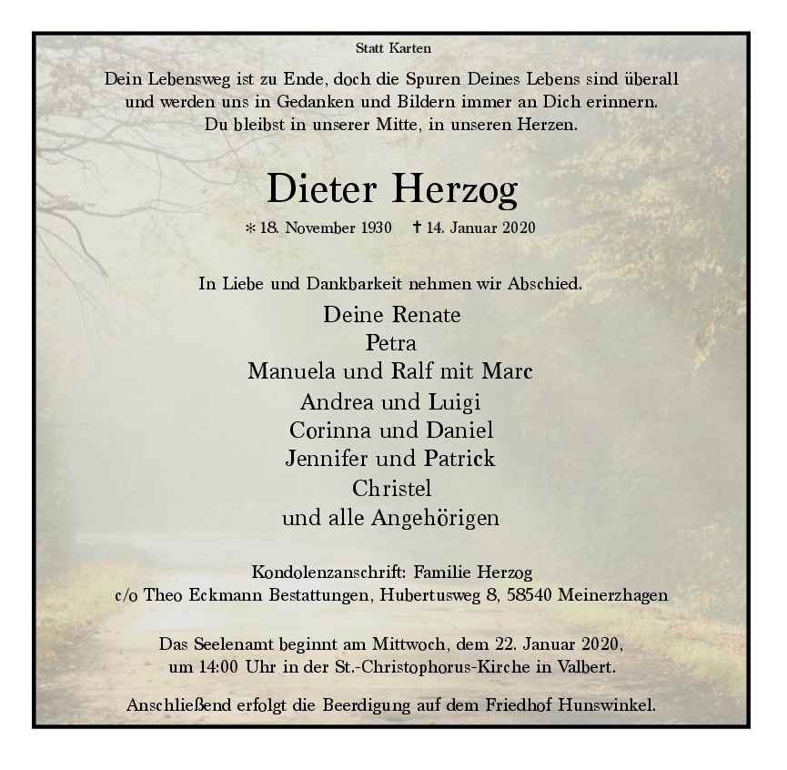 in diesen Tagen fühlen wir mit Ihnen und wünschen Ihnen von Herzen, dass Sie aus den glücklichen Erinnerungen Kraft schöpfen, um positiv in die Zukunft zu gehen. Diese Gedenkseite möge Ihnen dabei helfen, Ihre Trauer zu teilen und das Andenken gemeinsam wachzuhalten.