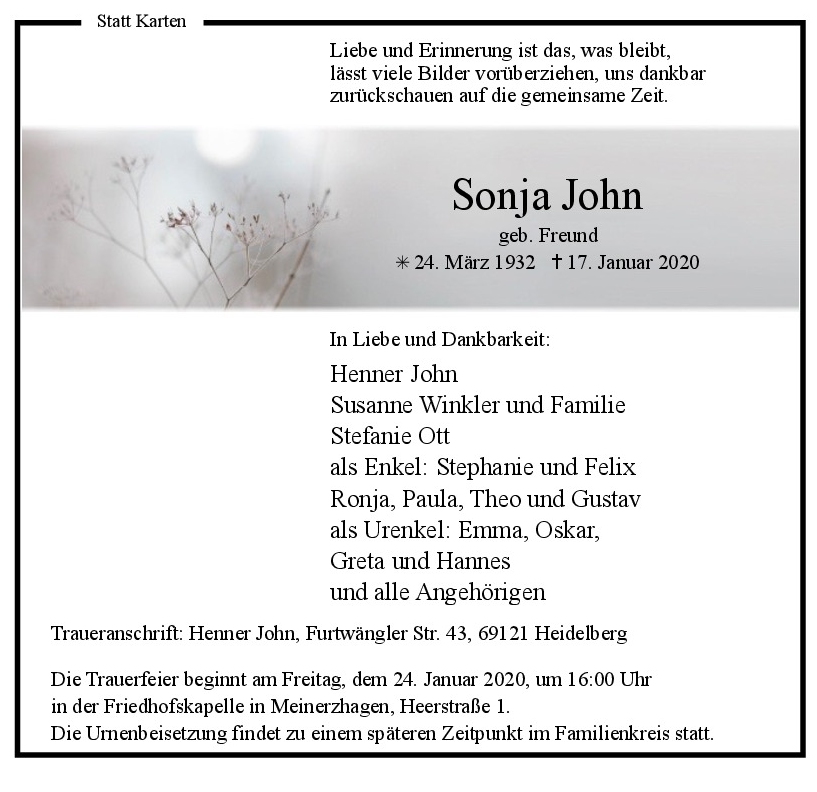 wir wünschen Ihnen von Herzen viel Kraft, dass Sie Menschen um sich haben, die Ihnen in dieser schweren Zeit beistehen und Halt geben. Zusätzlich können Sie auf dieser Gedenkseite Erinnerungen teilen und so das Andenken gemeinsam wachhalten.