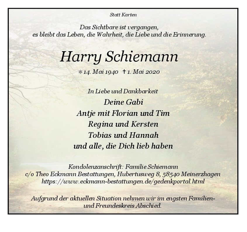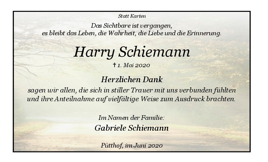Wir haben Harry als sehr offenherzigen, freundlichen und liebenswerten Menschen kennengelernt. Wir trauern mit Euch, wünschen Euch viel Kraft und hoffen, dass schon bald die schönen Erinnerungen an eine lange, erfüllte Zeit überwiegen können. Wolfgang, Sabine, Finn und Svea