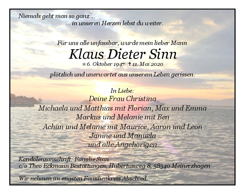 zurückzublicken. Diese Gedenkseite möge Ihnen dabei helfen, Ihre Trauer zu teilen und das Andenken gemeinsam wachzuhalten.