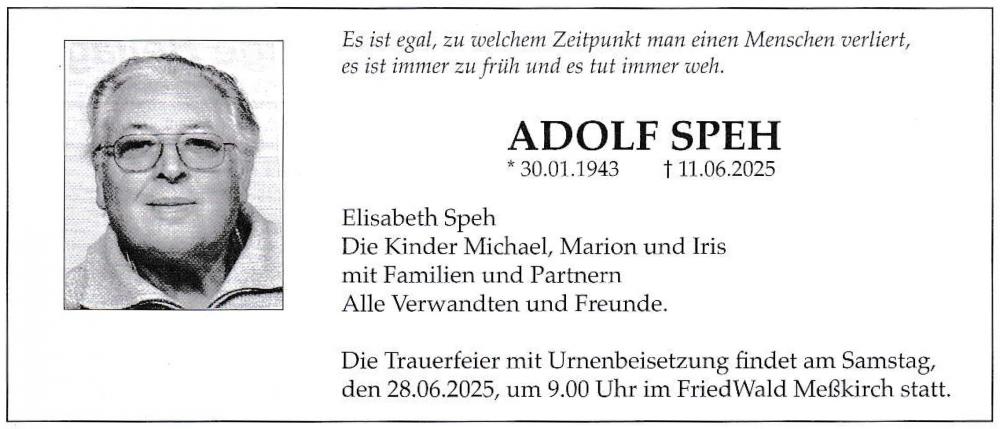 Trauerfeier am Samstag, 28. Juni 2025 um 9.00 Uhr im FriedWald Meßkirch mit anschließender Urnenbeisetzung.