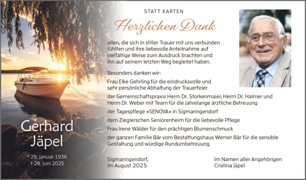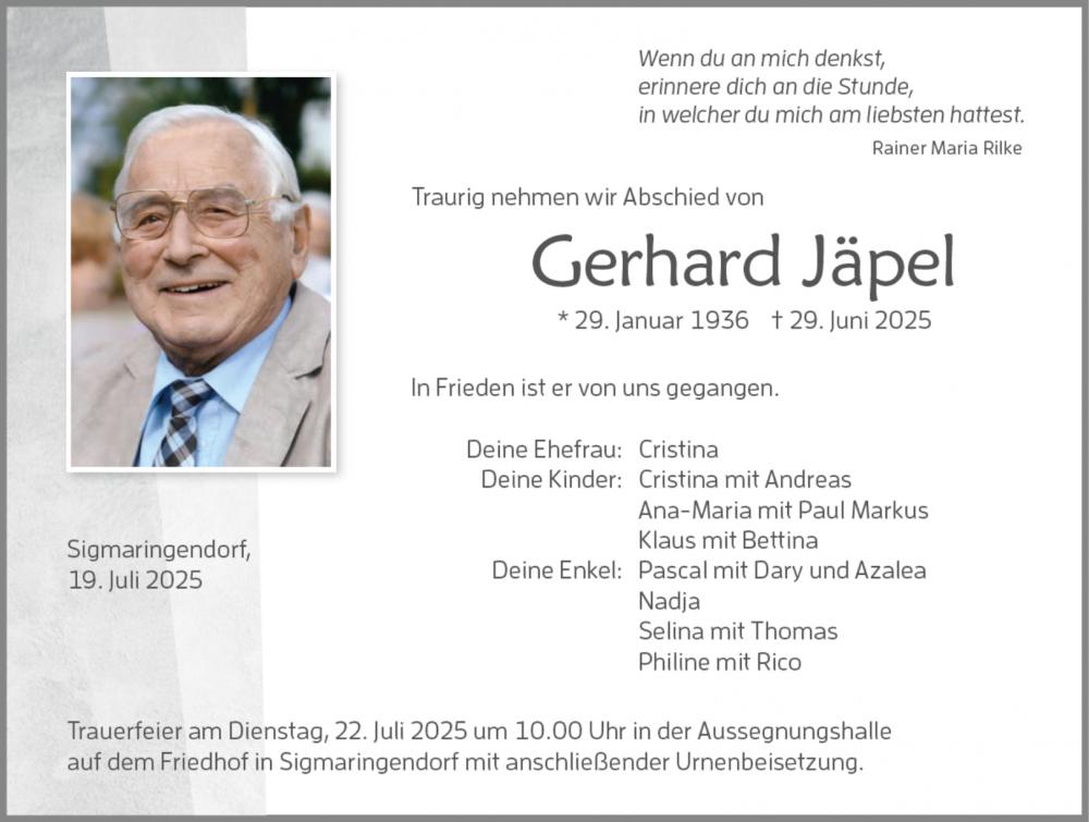 Trauerfeier am Dienstag, 22. Juli 2025 um 10.00 Uhr in der Aussegnungshalle auf dem Friedhof in Sigmaringendorf mit anschließender Urnenbeisetzung.