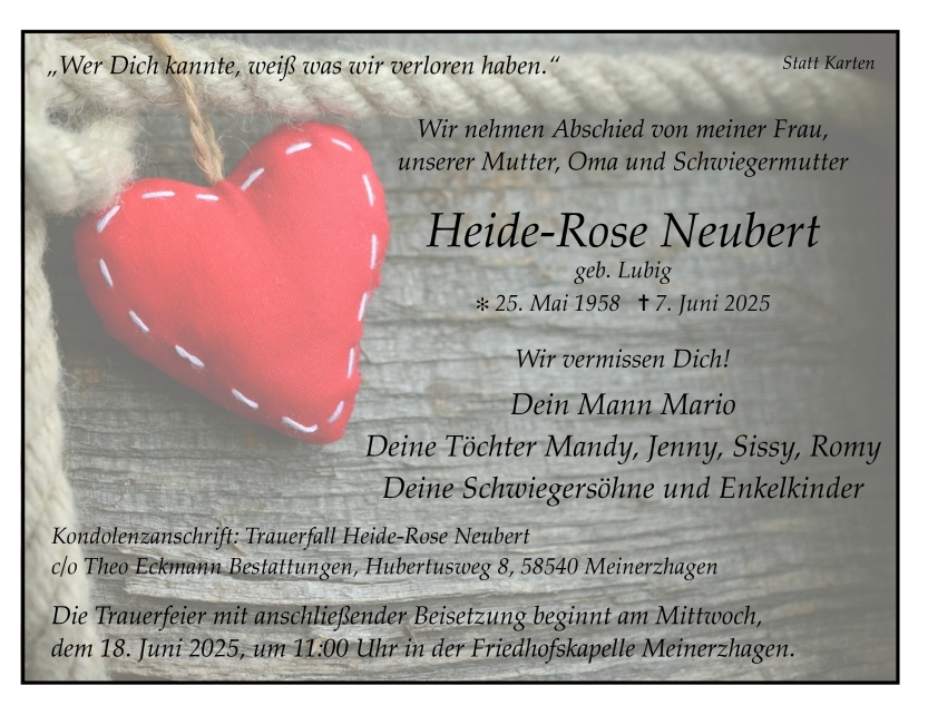 in diesen Tagen fühlen wir mit Ihnen und wünschen Ihnen von Herzen, dass Sie aus den glücklichen Erinnerungen Kraft schöpfen, um positiv in die Zukunft zu gehen. Diese Gedenkseite möge Ihnen dabei helfen, Ihre Trauer zu teilen und das Andenken gemeinsam wachzuhalten.