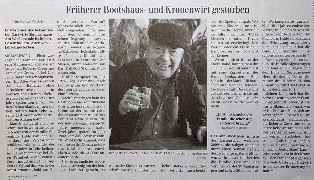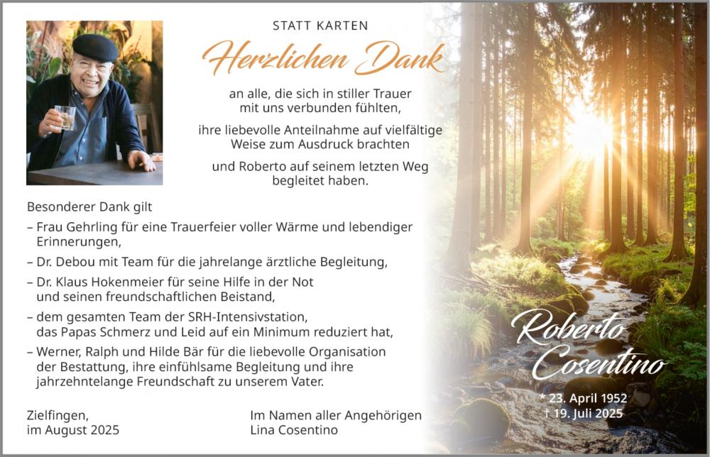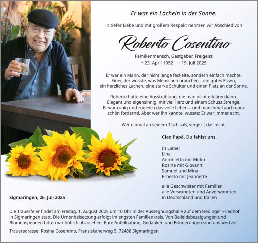 Trauerfeier am Freitag, 1. August 2025 um 10 Uhr in der Aussegnungshalle auf dem Hedinger Friedhof in Sigmaringen mit anschließender Urneneinbringung.