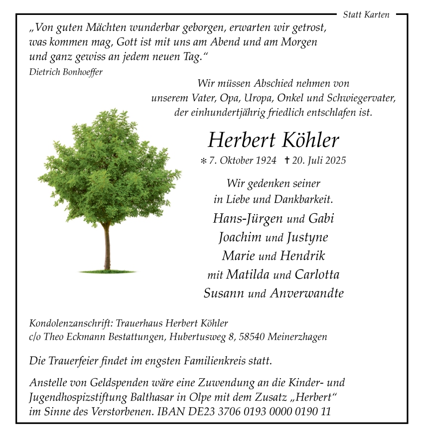 in diesen Tagen fühlen wir mit Ihnen und wünschen Ihnen von Herzen, dass Sie aus den glücklichen Erinnerungen Kraft schöpfen, um positiv in die Zukunft zu gehen. Diese Gedenkseite möge Ihnen dabei helfen, Ihre Trauer zu teilen und das Andenken gemeinsam wachzuhalten.