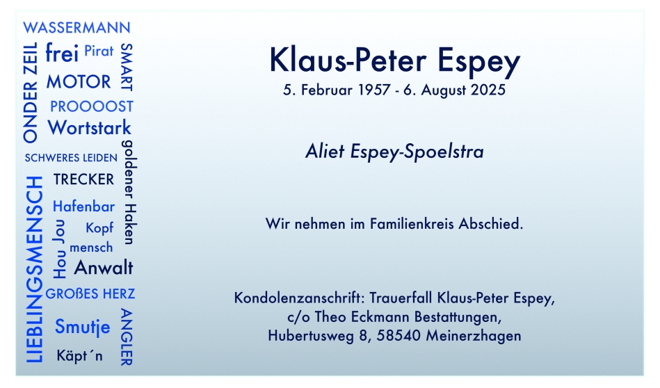 wir wünschen Dir von Herzen viel Kraft, dass Du Menschen um Dich hast, die Dir in der Zeit der Trauer beistehen und Halt geben. Zusätzlich können auf dieser Gedenkseite Erinnerungen geteilt werden um so das Andenken gemeinsam wachzuhalten.