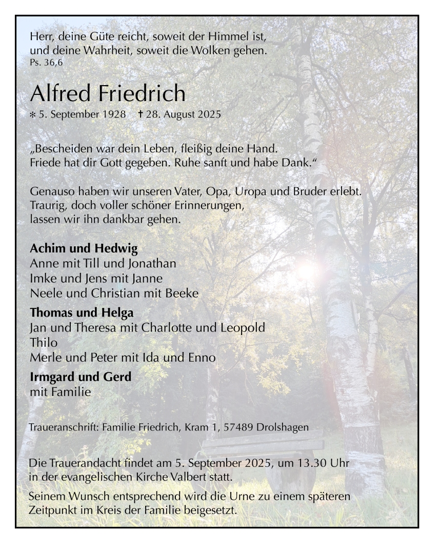in diesen Tagen fühlen wir mit Ihnen und wünschen Ihnen von Herzen, dass Sie aus den glücklichen Erinnerungen Kraft schöpfen, um positiv in die Zukunft zu gehen. Diese Gedenkseite möge Ihnen dabei helfen, Ihre Trauer zu teilen und das Andenken gemeinsam wachzuhalten.