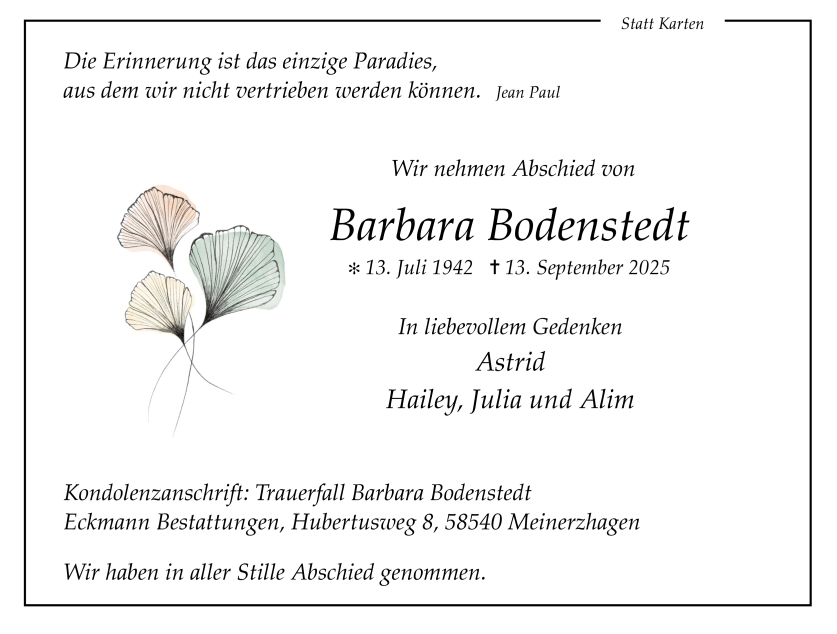 in diesen Tagen fühlen wir mit Ihnen und wünschen Ihnen von Herzen, dass Sie aus den glücklichen Erinnerungen Kraft schöpfen, um positiv in die Zukunft zu gehen. Diese Gedenkseite möge Ihnen dabei helfen, Ihre Trauer zu teilen und das Andenken gemeinsam wachzuhalten.