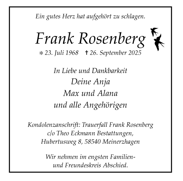in diesen Tagen fühlen wir mit Ihnen und wünschen Ihnen von Herzen, dass Sie aus den glücklichen Erinnerungen Kraft schöpfen, um positiv in die Zukunft zu gehen. Diese Gedenkseite möge Ihnen dabei helfen, Ihre Trauer zu teilen und das Andenken gemeinsam wachzuhalten.