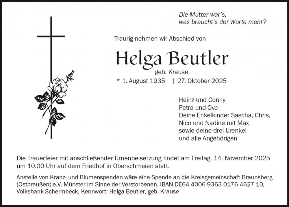 Dei Trauerfeier mit anschließender Urnenbeisetzung findet am Freitag, 14. November 2025 um 10.00 Uhr auf dem Friedhof in Oberschmeien statt.