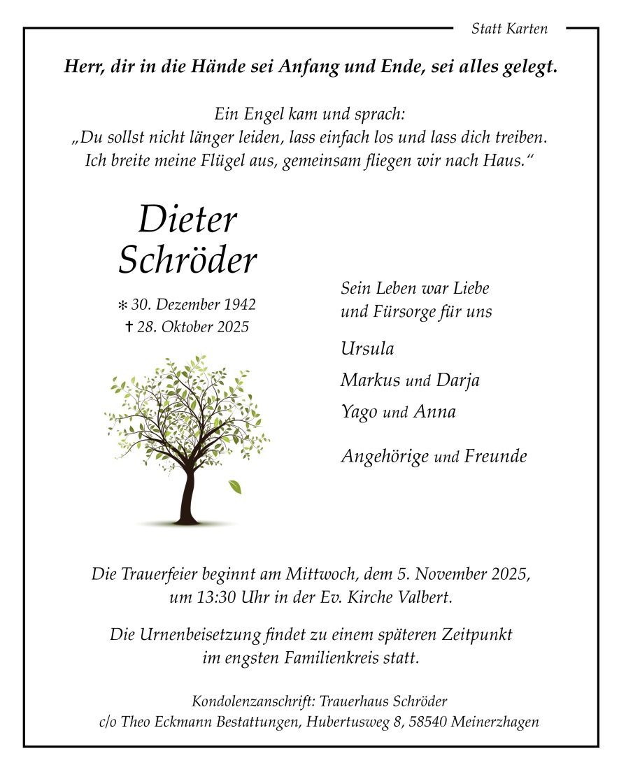 in diesen Tagen fühlen wir mit Ihnen und wünschen Ihnen von Herzen, dass Sie aus den glücklichen Erinnerungen Kraft schöpfen, um positiv in die Zukunft zu gehen. Diese Gedenkseite möge Ihnen dabei helfen, Ihre Trauer zu teilen und das Andenken gemeinsam wachzuhalten.