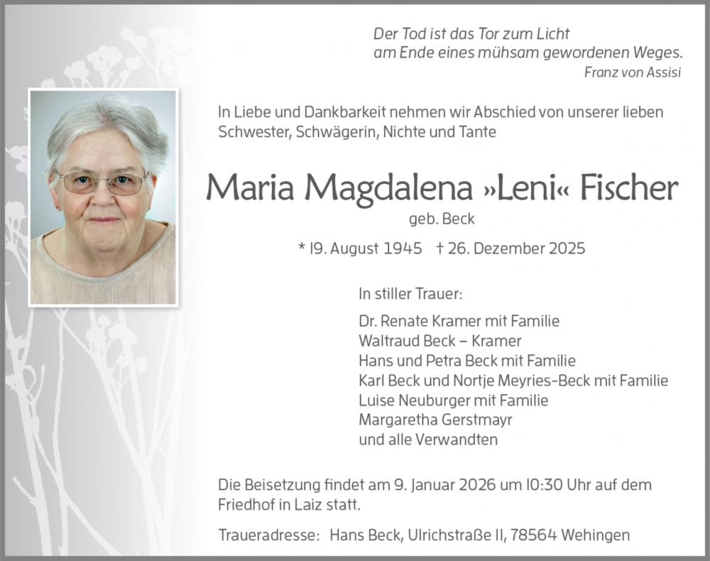 Trauerfeier am Freitag, 9. Januar 2026 um 10.30 Uhr auf dem Friedhof in Laiz mit anschließender Urnenbeisetzung.
