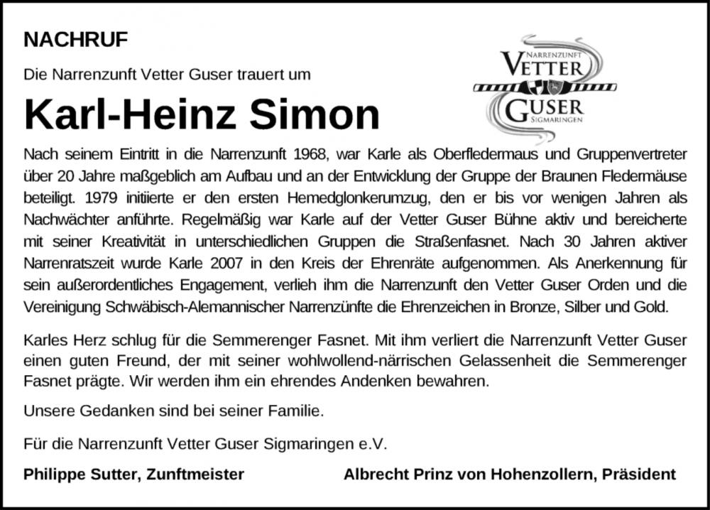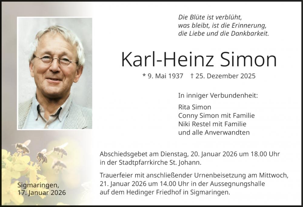 Trauerfeier mit anschließender Urnenbeisetzung am Mittwoch, 21. Januar 2026 um 14.00 Uhr in der Aussegnungshalle auf dem Hedinger Friedhof in Sigmaringen.