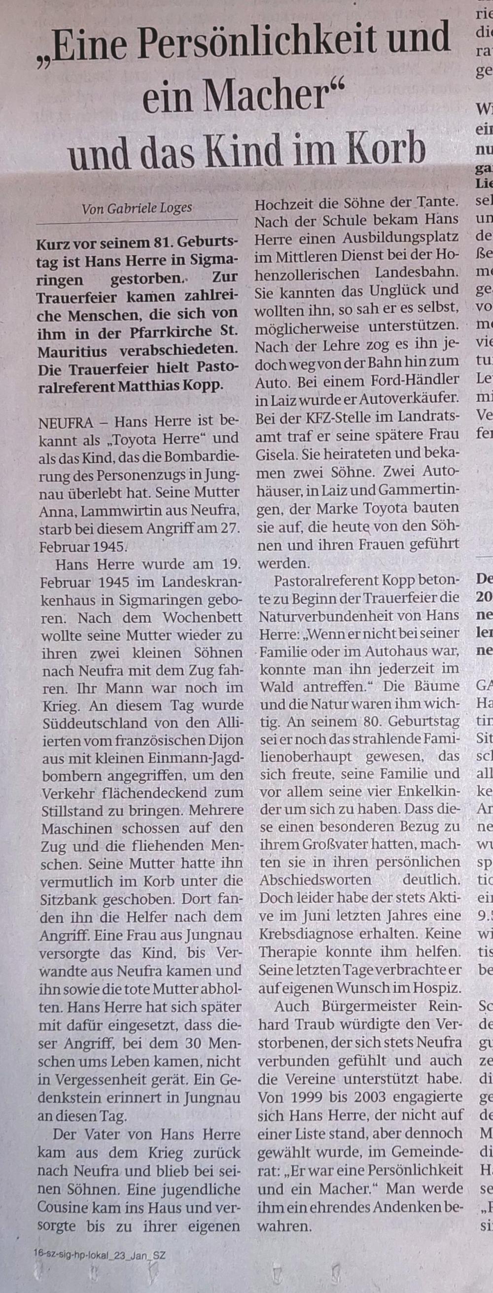 Trauerfeier am Mittwoch, 21. Januar 2026 um 10.00 Uhr in der Pfarrkirche St. Mauritius in Neufra mit anschließender Verabschiedung am Sarg.