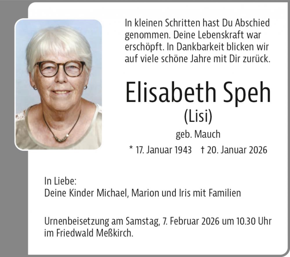 Urnenbeisetzung am Samstag, 7. Februar 2026 um 10.30 Uhr im FriedWald Meßkirch.