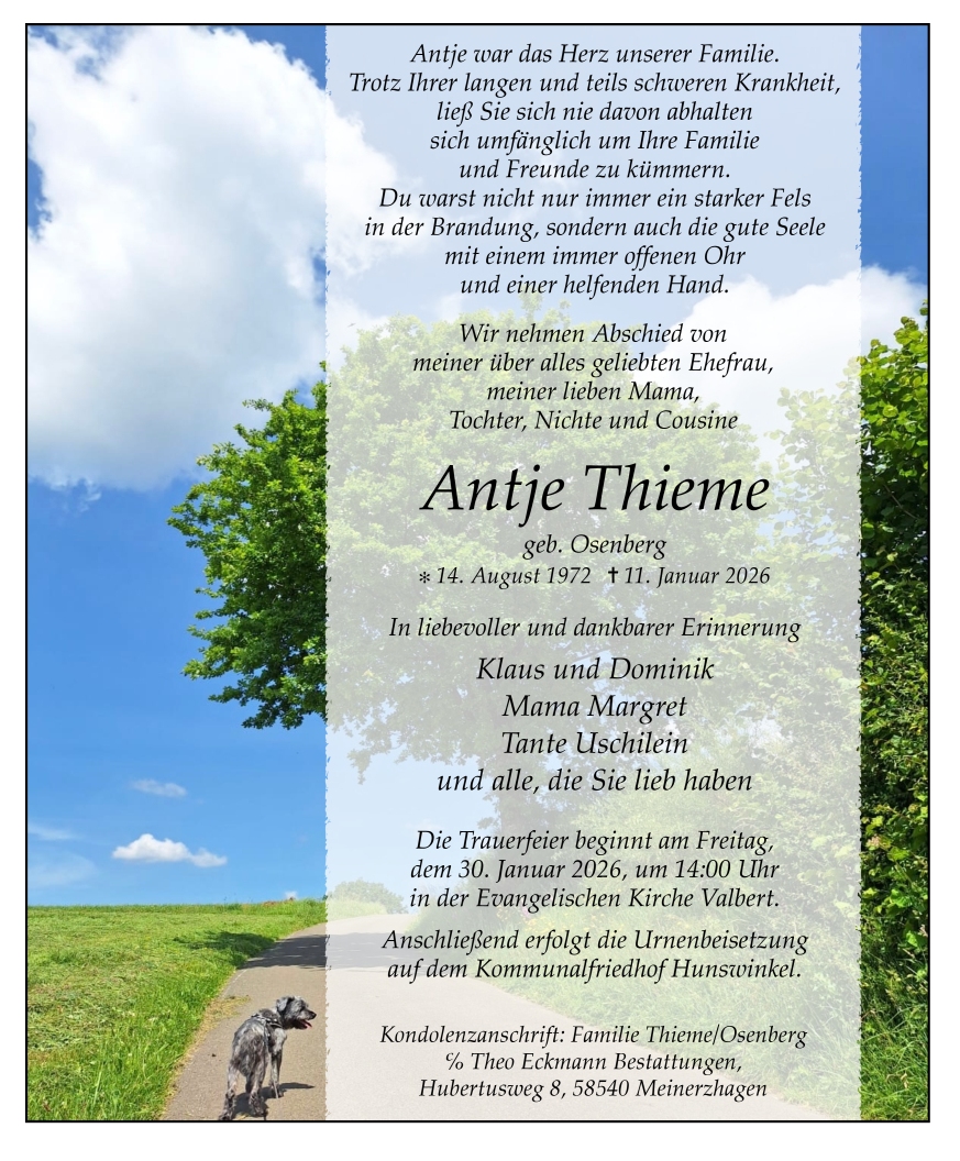Zusätzlich können auf dieser Gedenkseite Erinnerungen geteilt werden um so das Andenken an Antje gemeinsam wachzuhalten.