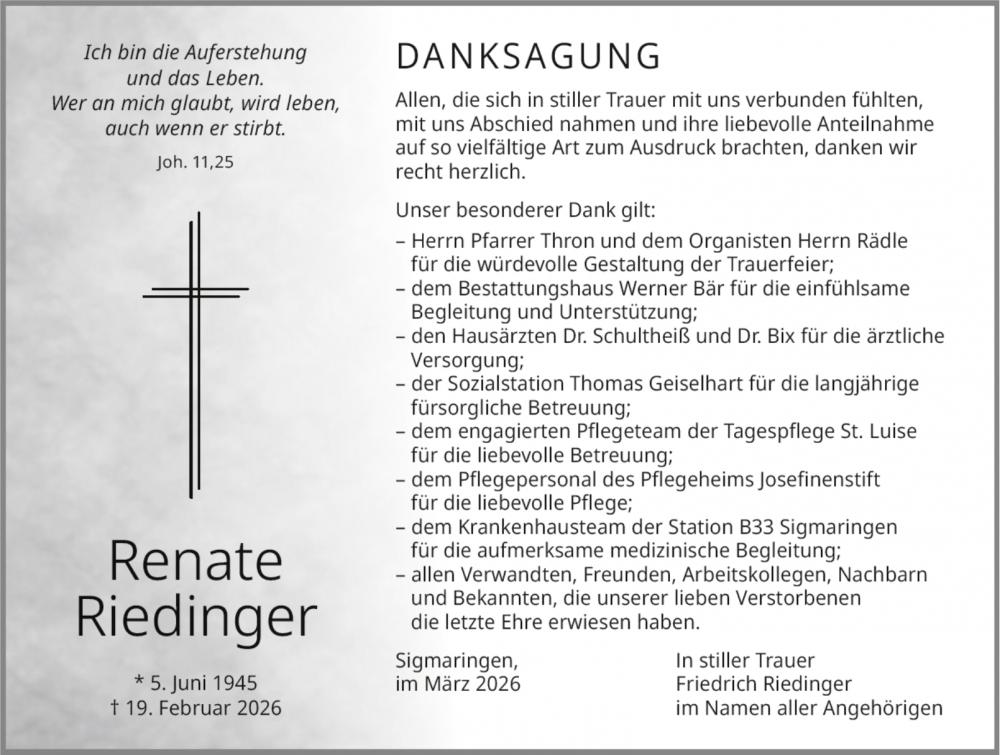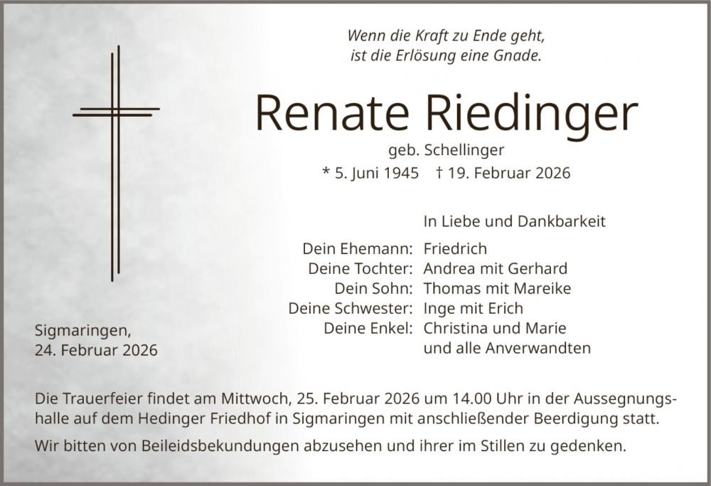 Die Trauerfeier findet am Mittwoch, 25. Februar 2026 um 14.00 Uhr in der Aussegnungshalle auf dem Hedinger Friedhof in Sigmaringen mit anschließender Beerdigung statt.