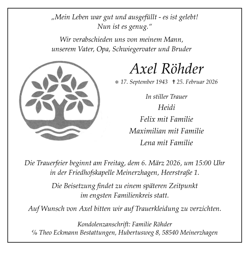 in diesen Tagen fühlen wir mit Ihnen und wünschen Ihnen von Herzen, dass Sie aus den glücklichen Erinnerungen Kraft schöpfen, um positiv in die Zukunft zu gehen. Diese Gedenkseite möge Ihnen dabei helfen, Ihre Trauer zu teilen und das Andenken gemeinsam wachzuhalten.