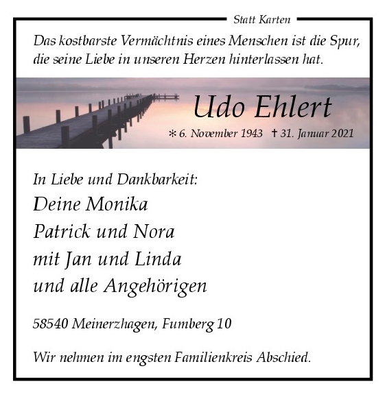 in diesen Tagen fühlen wir mit Ihnen und wünschen Ihnen von Herzen, dass Sie aus den glücklichen Erinnerungen Kraft schöpfen, um positiv in die Zukunft zu gehen. Diese Gedenkseite möge Ihnen dabei helfen, Ihre Trauer zu teilen und das Andenken gemeinsam wachzuhalten.