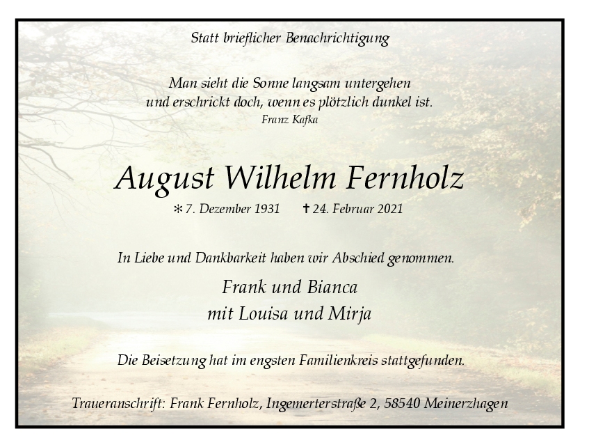 in diesen Tagen fühlen wir mit Ihnen und wünschen Ihnen von Herzen, dass Sie aus den glücklichen Erinnerungen Kraft schöpfen, um positiv in die Zukunft zu gehen. Diese Gedenkseite möge Ihnen dabei helfen, Ihre Trauer zu teilen und das Andenken gemeinsam wachzuhalten.