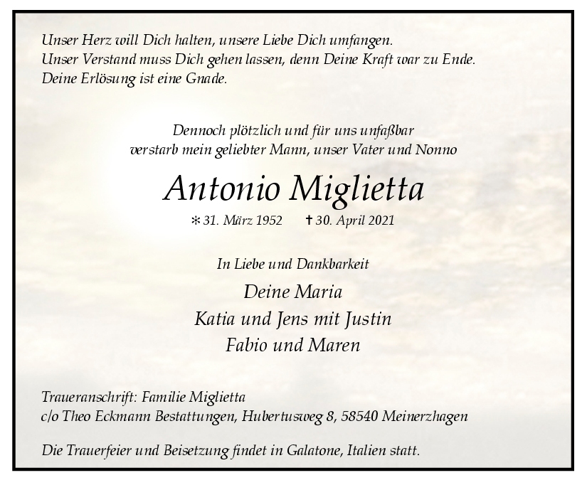 in dieser Zeit des Schmerzes wünschen wir Ihnen Kraft, den Verlust im Kreise Ihrer Liebsten zu verarbeiten. Als Zeichen unserer Anteilnahme und des Gedenkens entzünden wir dieses erste Licht. Möge diese Gedenkseite Ihnen helfen, Erinnerungen zu teilen und so das Andenken gemeinsam wachzuhalten.