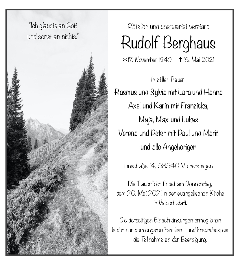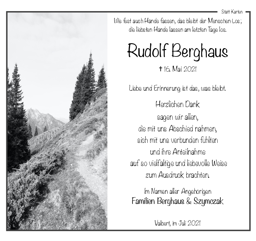 in diesen Tagen fühlen wir mit Ihnen und wünschen Ihnen von Herzen, dass Sie aus den glücklichen Erinnerungen Kraft schöpfen, um positiv in die Zukunft zu gehen. Diese Gedenkseite möge Ihnen dabei helfen, Ihre Trauer zu teilen und das Andenken gemeinsam wachzuhalten.