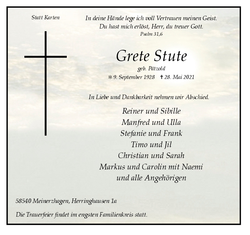 wir wünschen Ihnen von Herzen viel Kraft, dass Sie Menschen um sich haben, die Ihnen in dieser schweren Zeit beistehen und Halt geben. Zusätzlich können Sie auf dieser Gedenkseite Erinnerungen teilen und so das Andenken gemeinsam wachhalten.