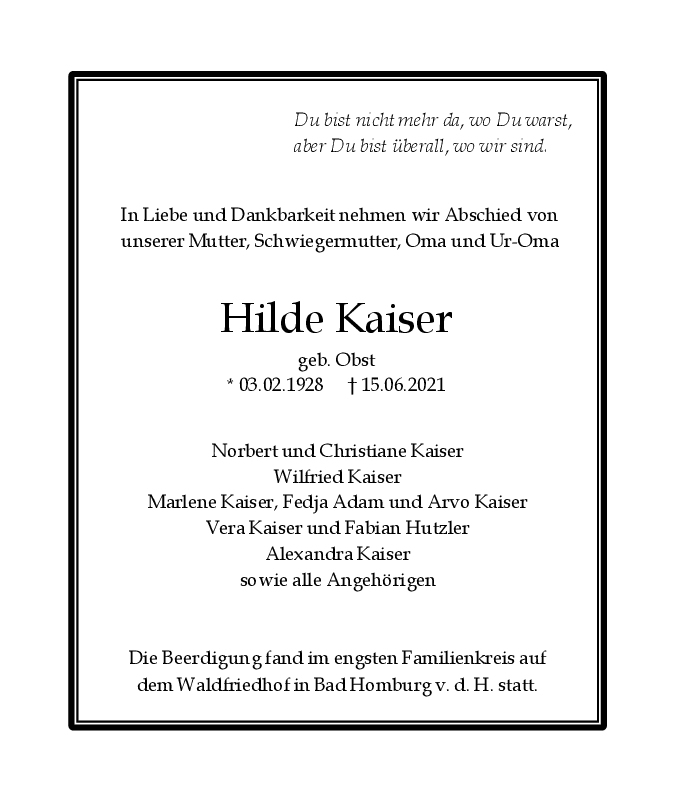 †15.06.2021, Ruhestätte: Waldfriedhof, Bad Homburg