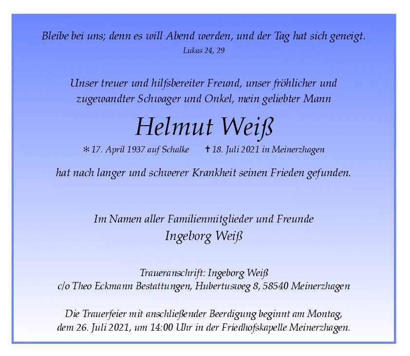 wir wünschen Ihnen von Herzen viel Kraft, dass Sie Menschen um sich haben, die Ihnen in dieser schweren Zeit beistehen und Halt geben. Zusätzlich können Sie auf dieser Gedenkseite Erinnerungen teilen und so das Andenken gemeinsam wachhalten.